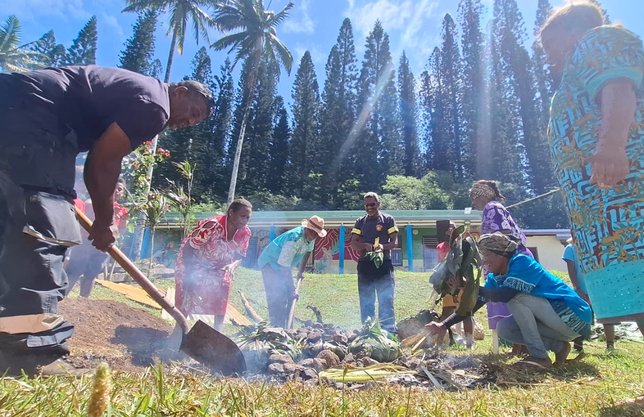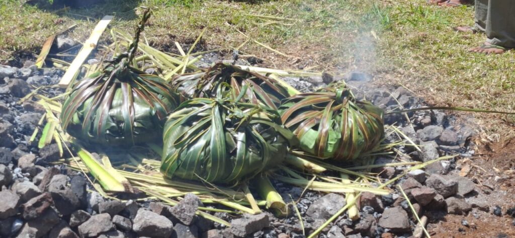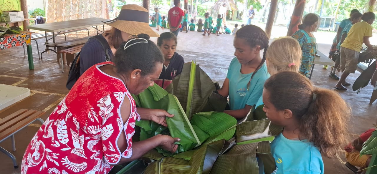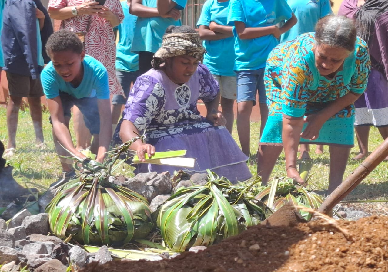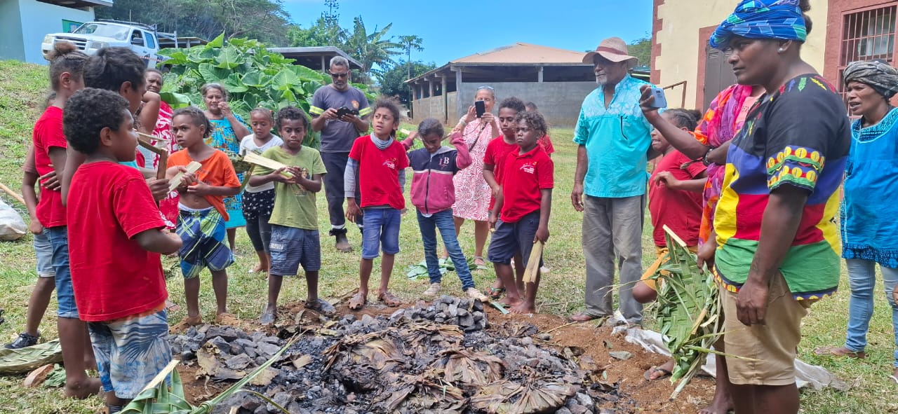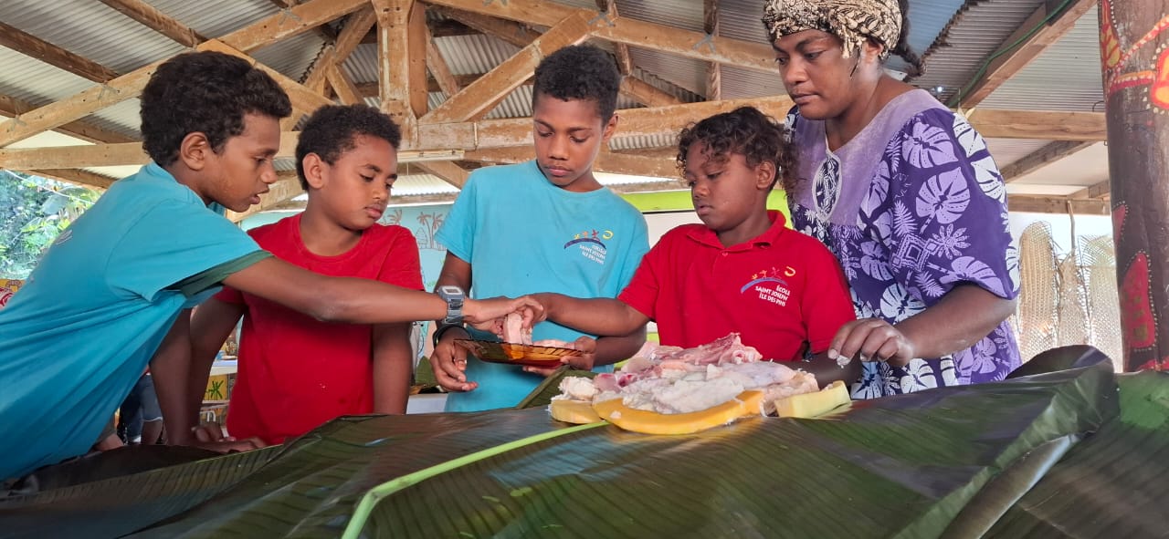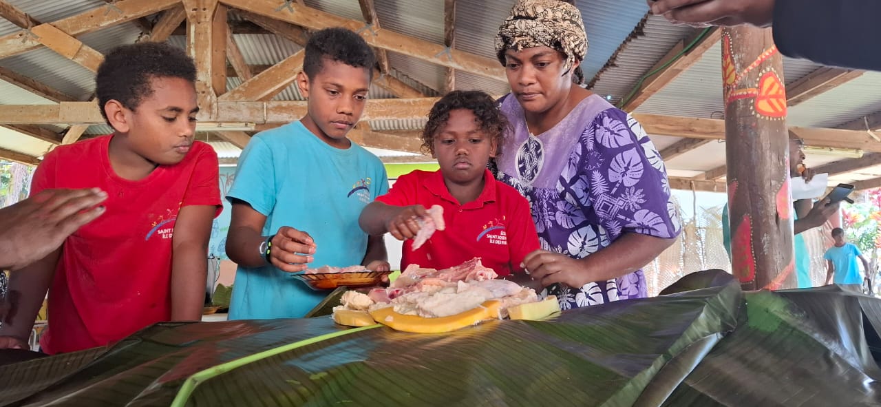 Tout a commencé par une démonstration animée par Mme Caroline Kaateu, qui a guidé les élèves pas à pas dans la préparation de ce mets traditionnel. Avec son expérience et sa pédagogie, elle a montré comment disposer les différents ingrédients : ignames, patates douces, bananes, taros, légumes et morceaux de poulet, boulette de manioc… Le tout, enveloppé soigneusement dans de larges feuilles de bananier, a captivé l’attention des jeunes spectateurs.