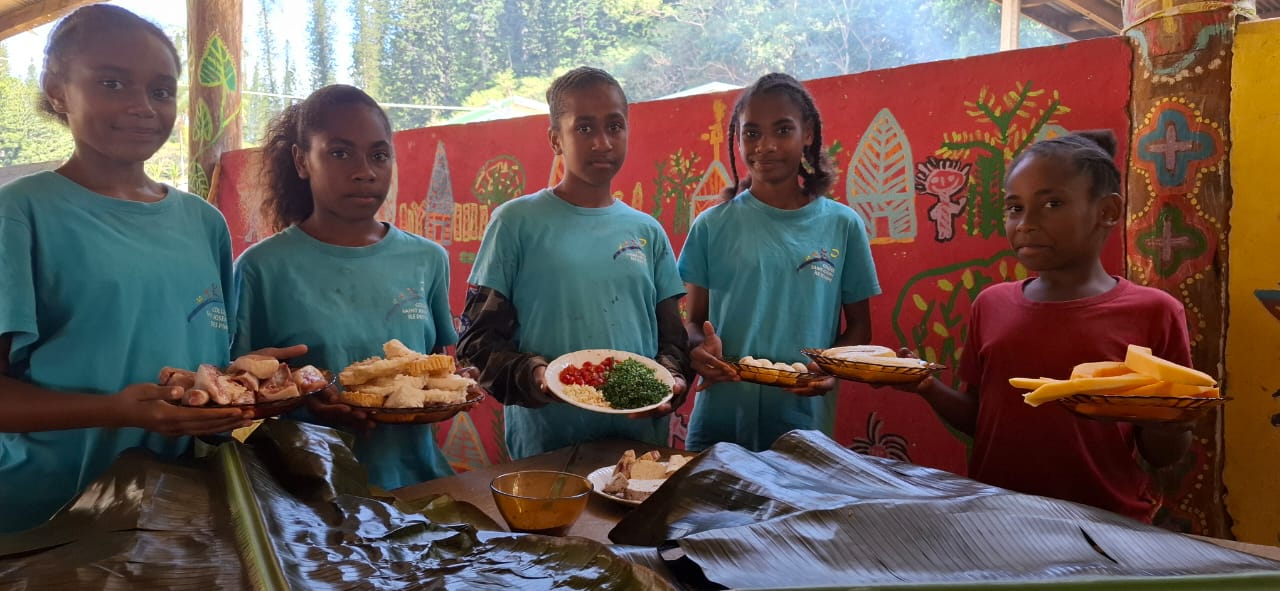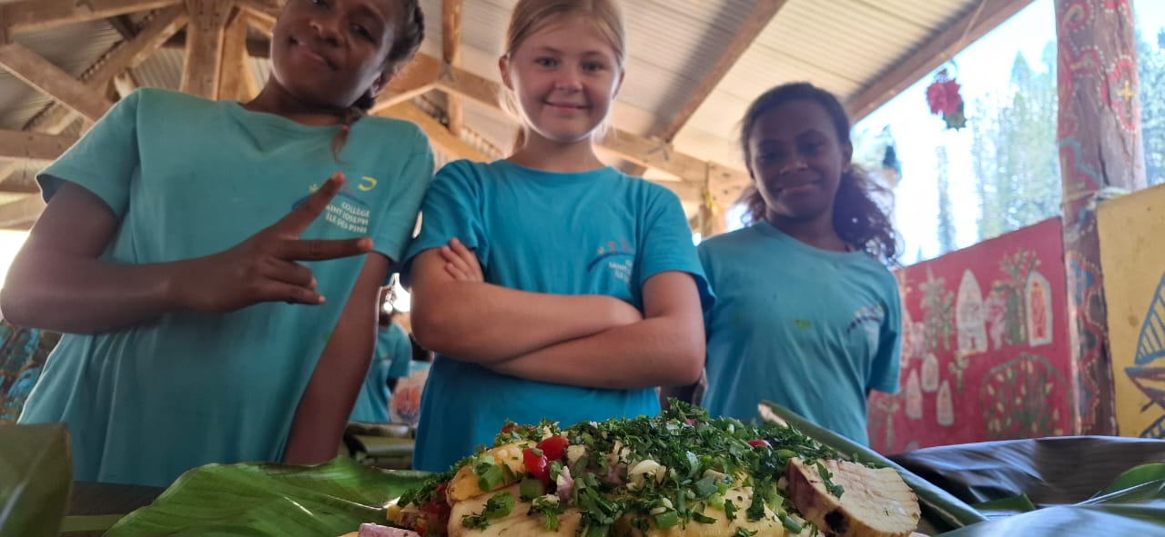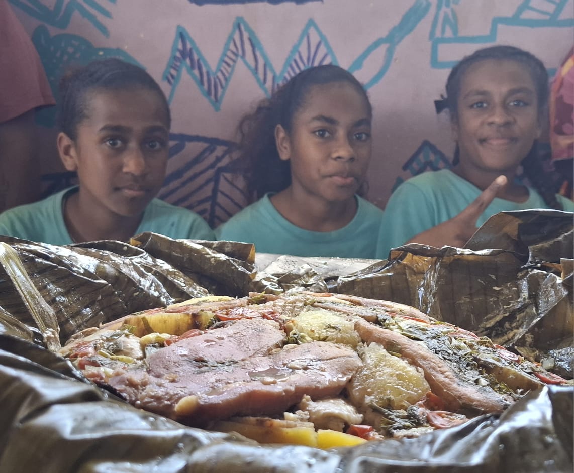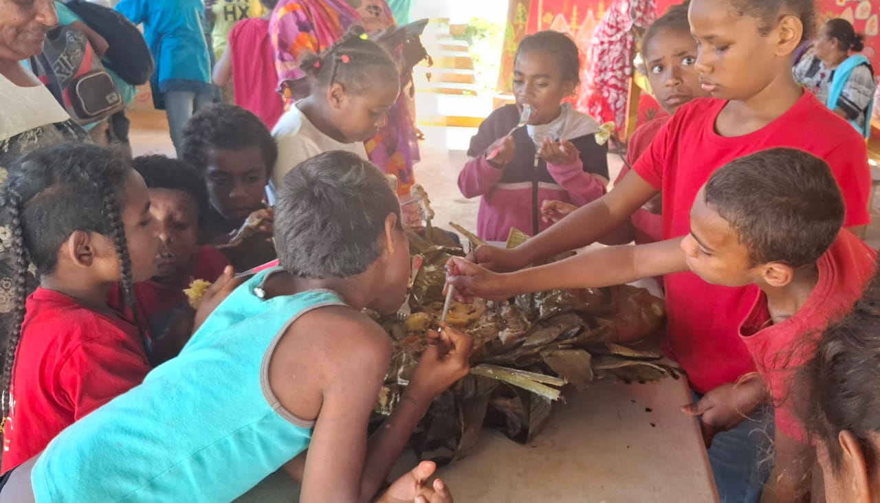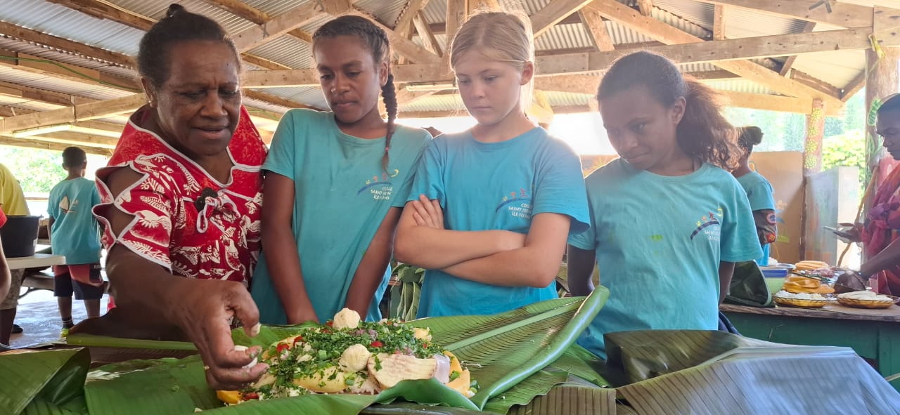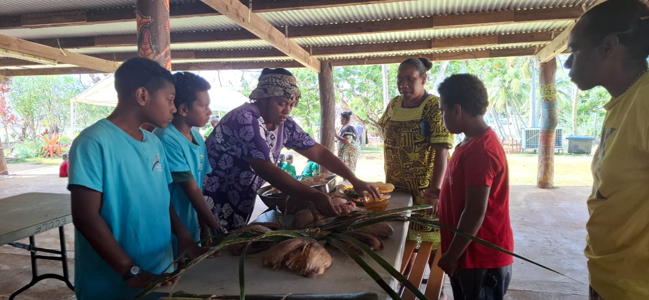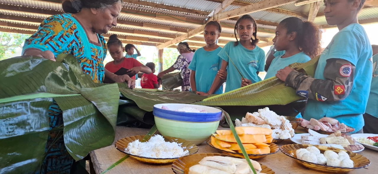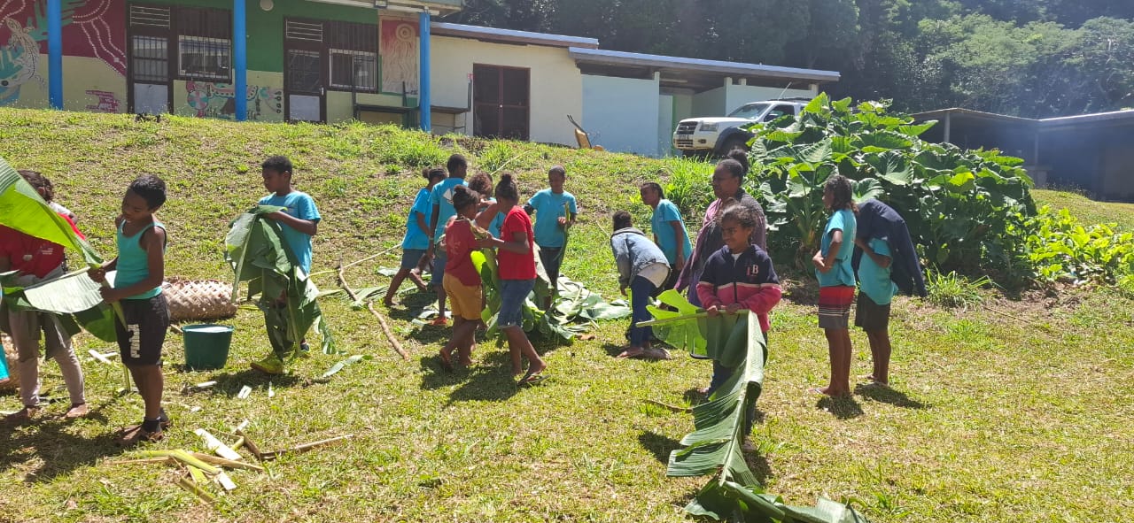 Tout a commencé par une démonstration animée par Mme Caroline Kaateu, qui a guidé les élèves pas à pas dans la préparation de ce mets traditionnel. Avec son expérience et sa pédagogie, elle a montré comment disposer les différents ingrédients : ignames, patates douces, bananes, taros, légumes et morceaux de poulet, boulette de manioc… Le tout, enveloppé soigneusement dans de larges feuilles de bananier, a captivé l’attention des jeunes spectateurs.