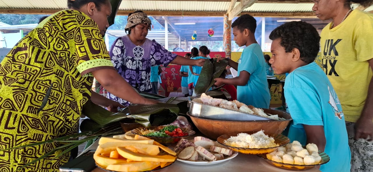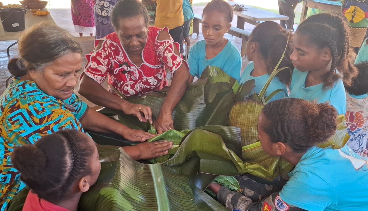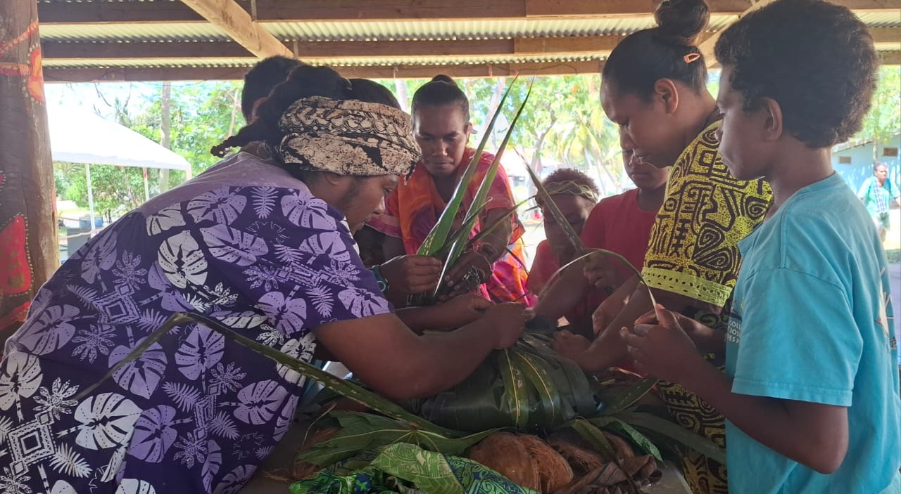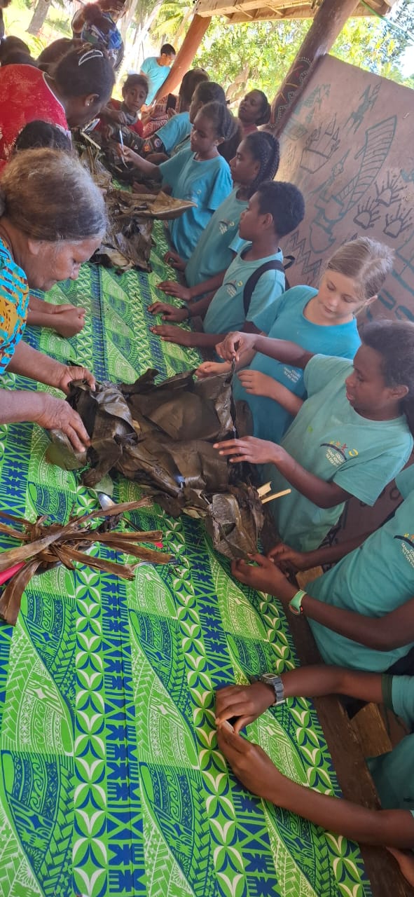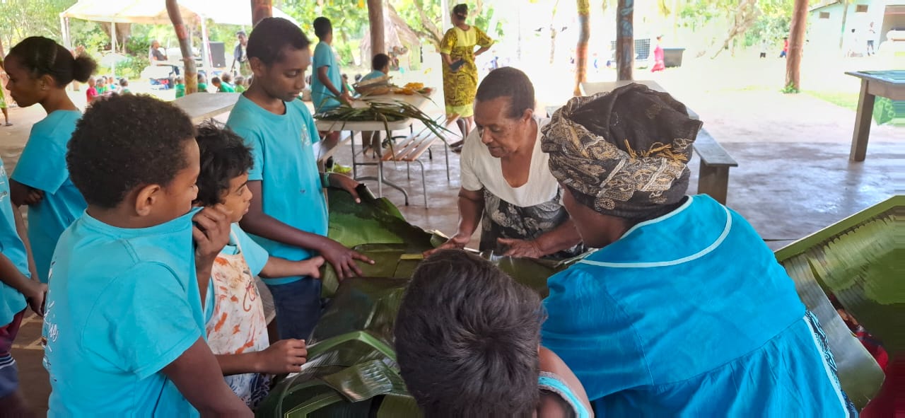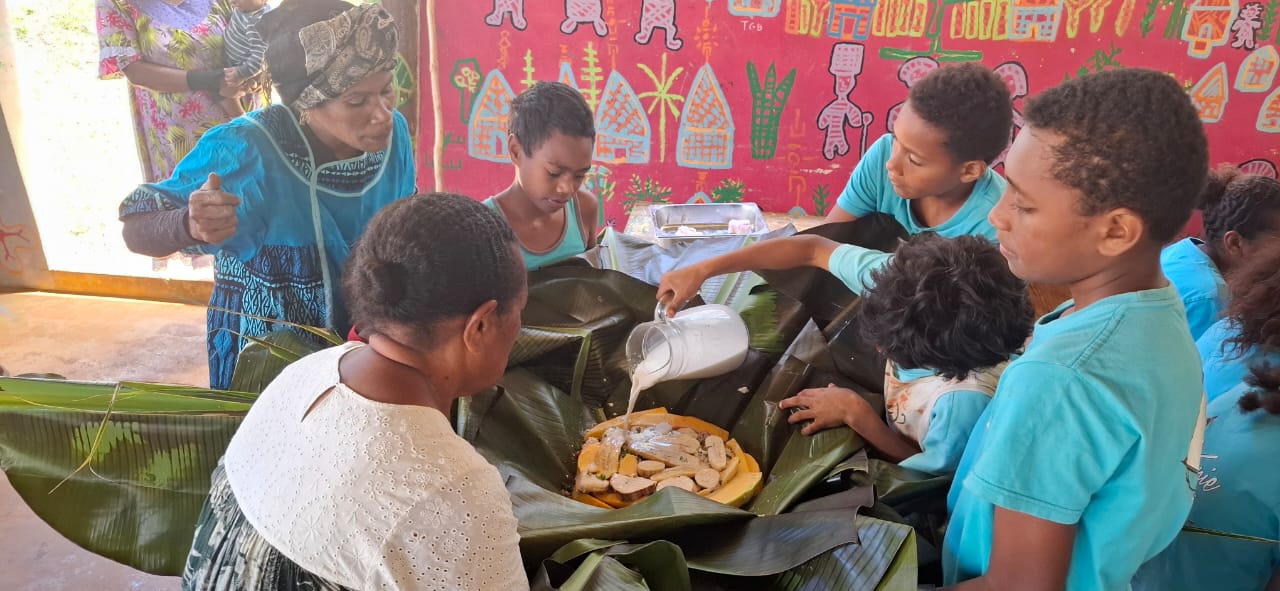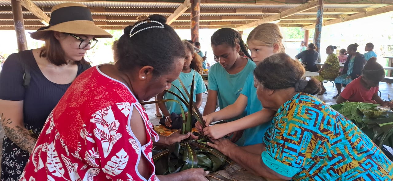 Tout a commencé par une démonstration animée par Mme Caroline Kaateu, qui a guidé les élèves pas à pas dans la préparation de ce mets traditionnel. Avec son expérience et sa pédagogie, elle a montré comment disposer les différents ingrédients : ignames, patates douces, bananes, taros, légumes et morceaux de poulet, boulette de manioc… Le tout, enveloppé soigneusement dans de larges feuilles de bananier, a captivé l’attention des jeunes spectateurs.