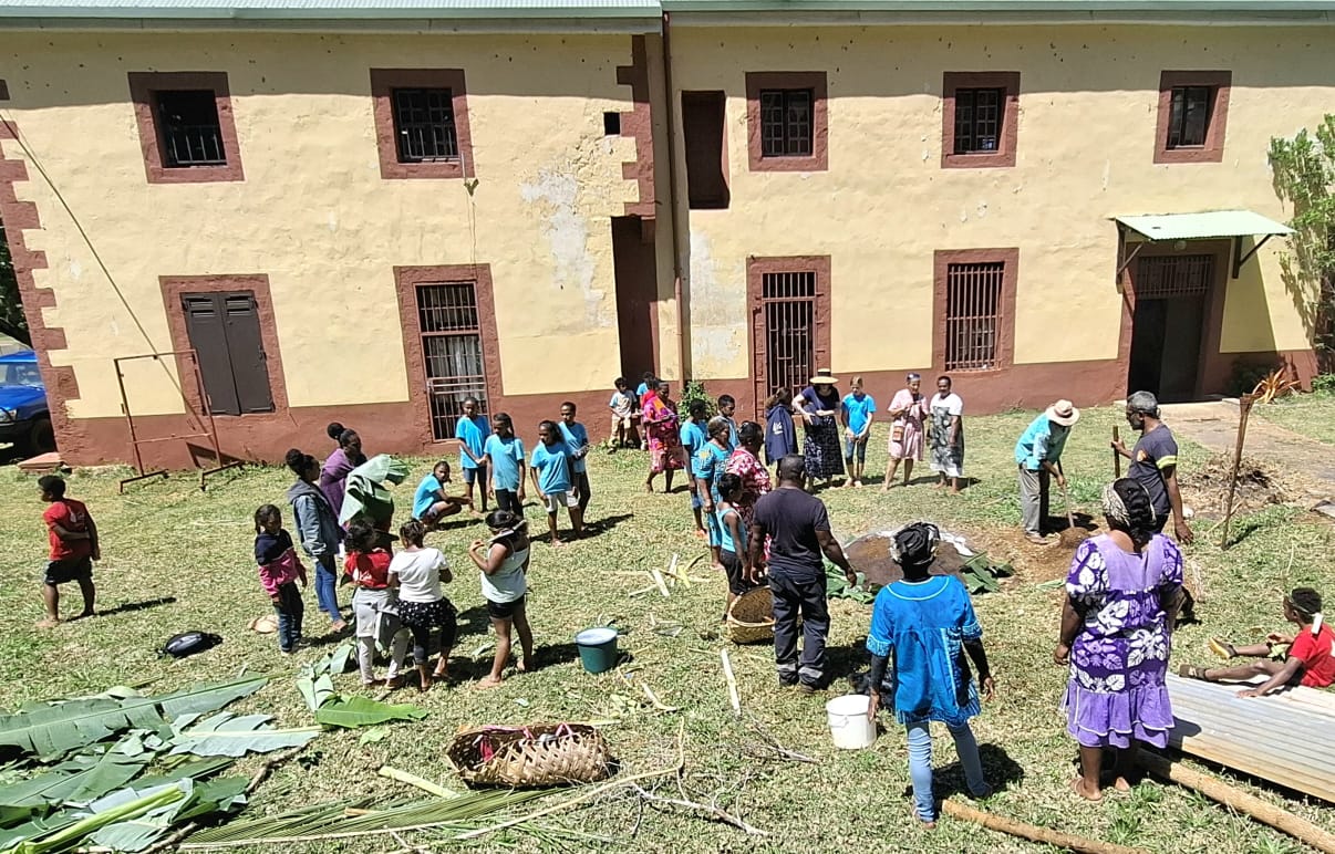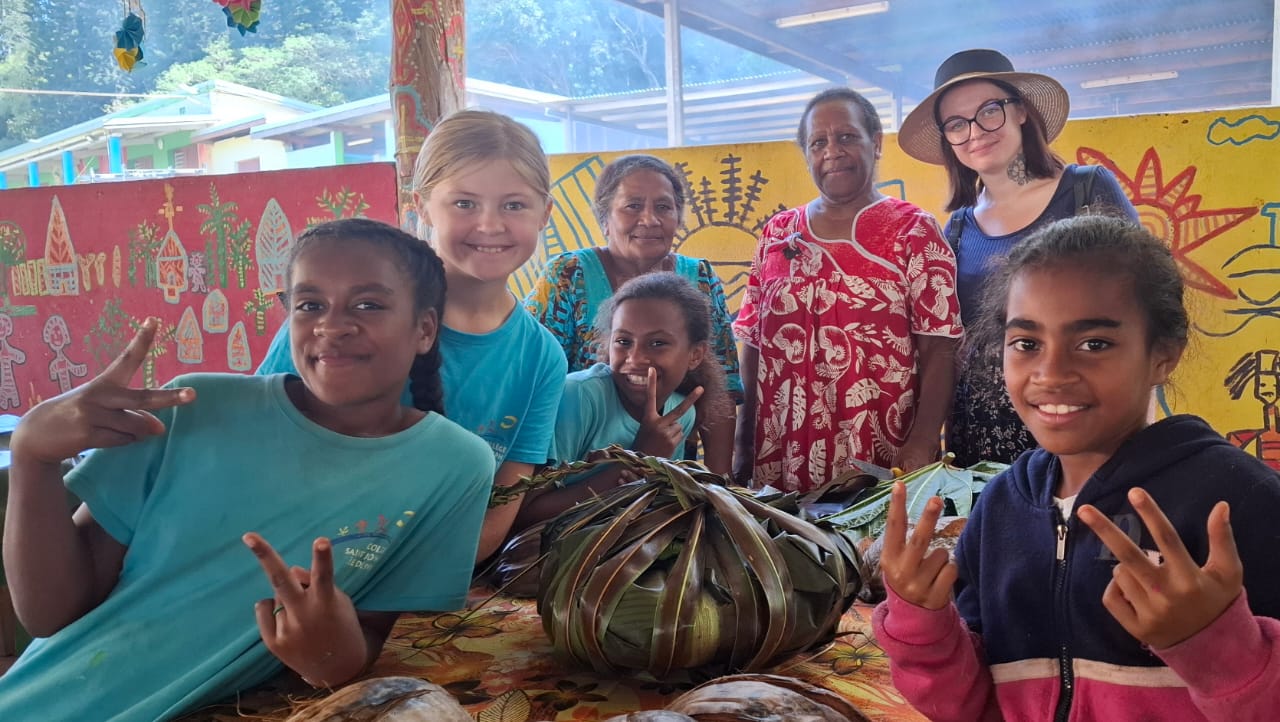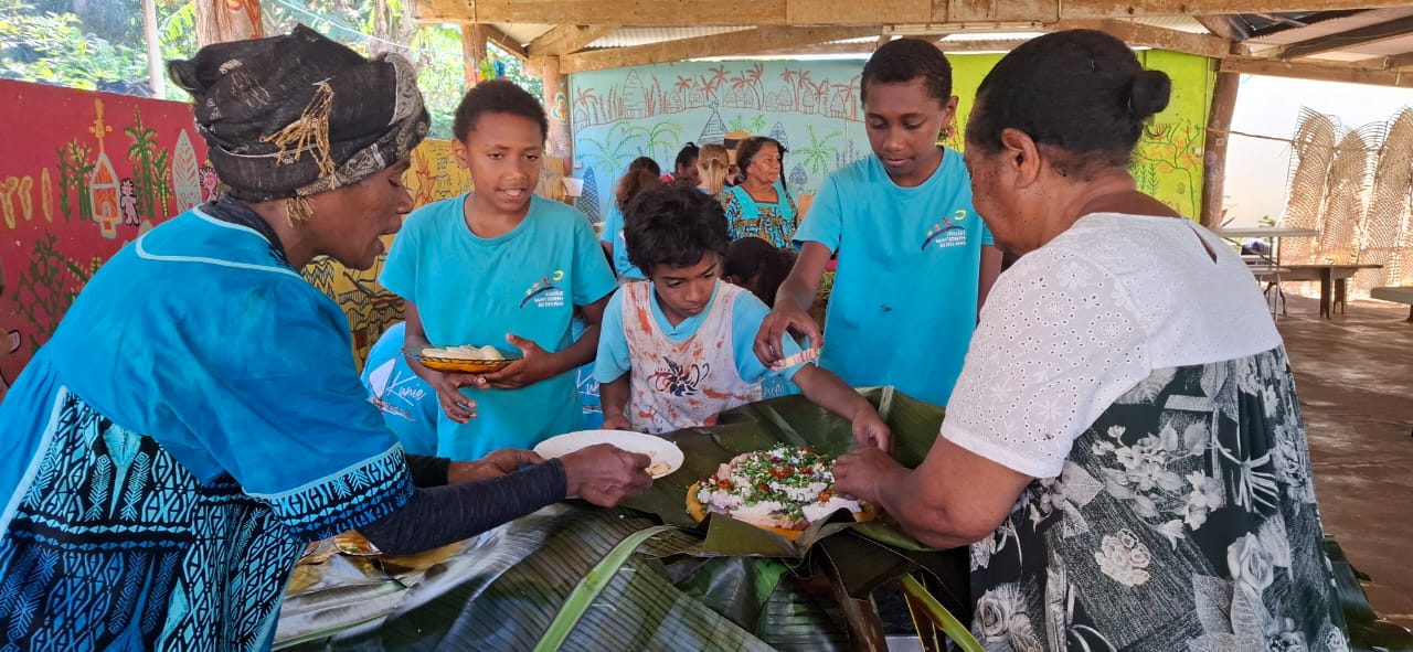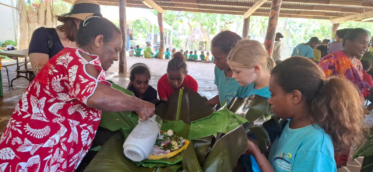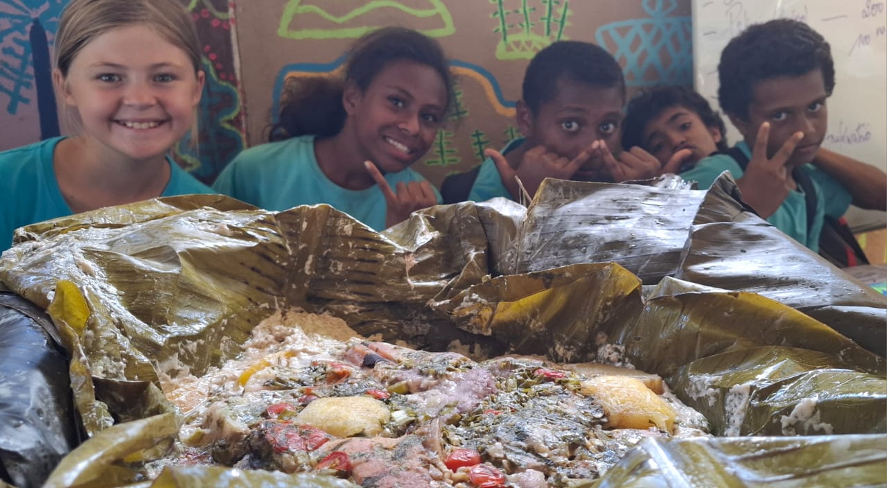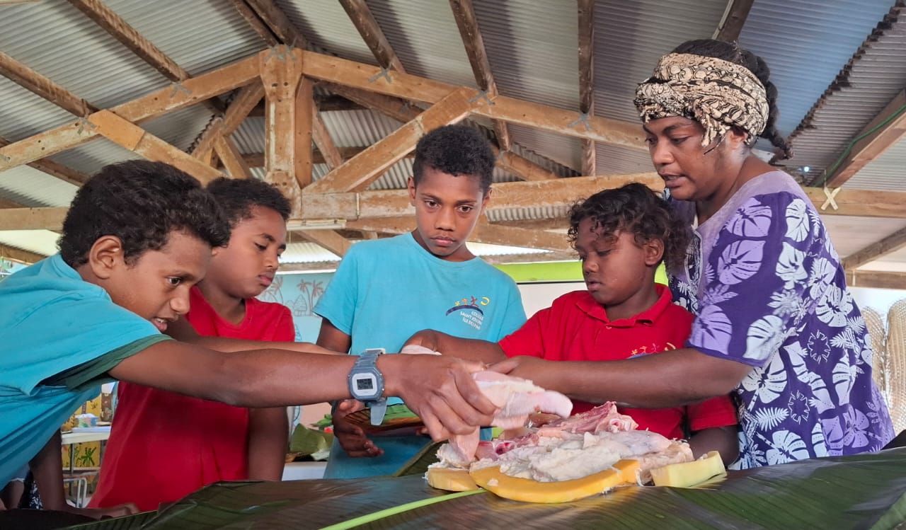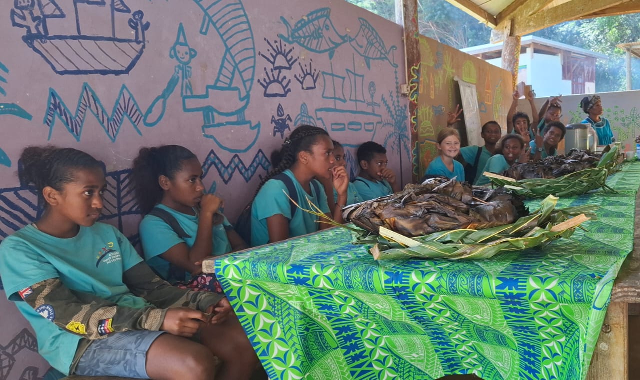 Tout a commencé par une démonstration animée par Mme Caroline Kaateu, qui a guidé les élèves pas à pas dans la préparation de ce mets traditionnel. Avec son expérience et sa pédagogie, elle a montré comment disposer les différents ingrédients : ignames, patates douces, bananes, taros, légumes et morceaux de poulet, boulette de manioc… Le tout, enveloppé soigneusement dans de larges feuilles de bananier, a captivé l’attention des jeunes spectateurs.